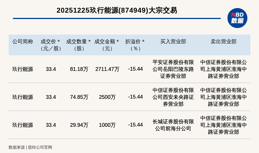 每經(jīng)訊,2025年12月25日,新三板基礎(chǔ)層公司玖行能源(874949,收盤價(jià):39.5元)發(fā)生3筆大宗交易,總成交金額為6211.46萬元,成交金額最高的一筆成交價(jià)33.4元/股,成交數(shù)量81.18萬股,成交金額2711.47萬元,折價(jià)15.44%。買入營業(yè)部是平安證券股份有限公司岳陽巴陵東路證券營業(yè)部,賣出營業(yè)部是中信證券股份有限公司上海黃浦區(qū)淮海中路證券營業(yè)部。