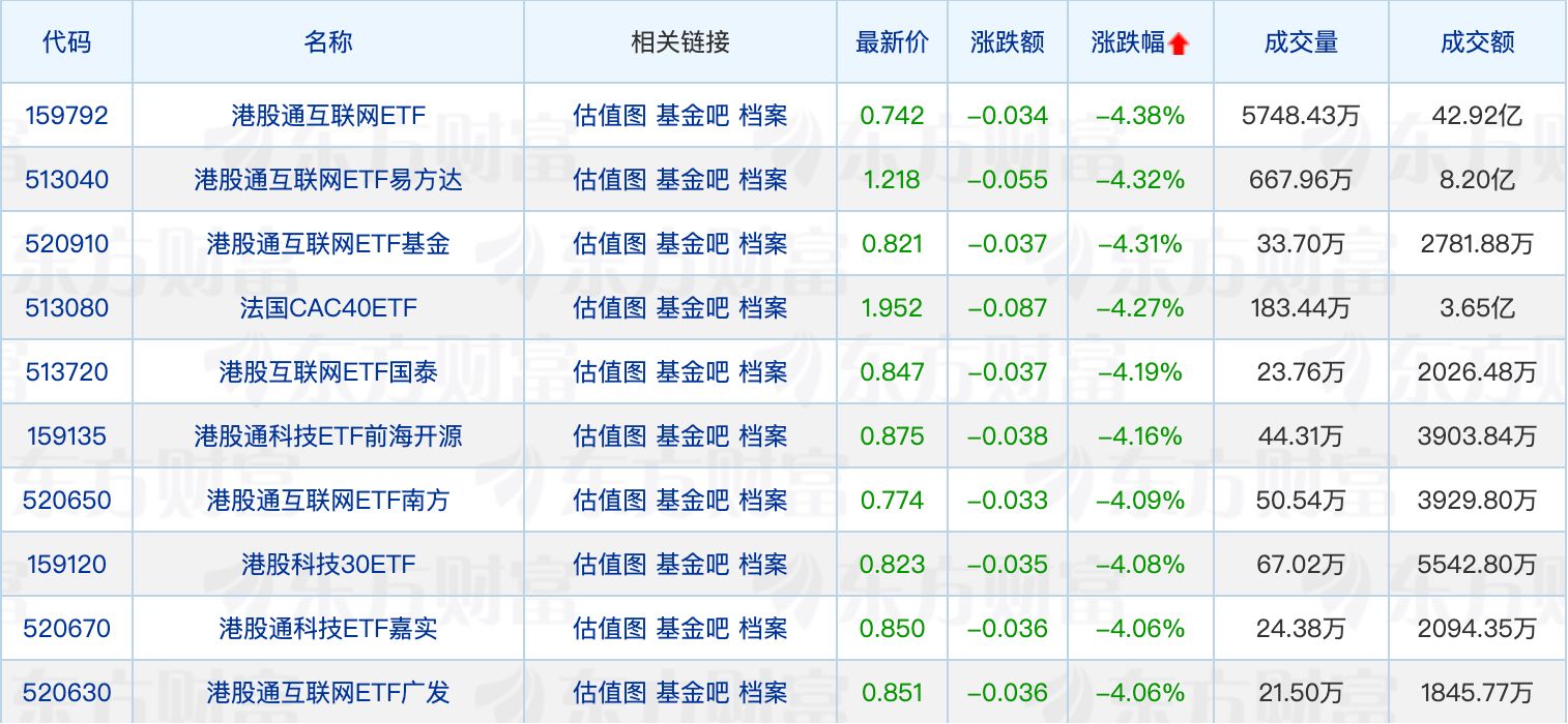 下跌方面,港股互聯(lián)網(wǎng)相關ETF跌超4%。