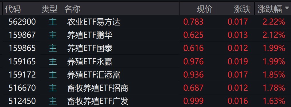 受盤面影響,農(nóng)業(yè)、養(yǎng)殖相關(guān)ETF漲約2%。