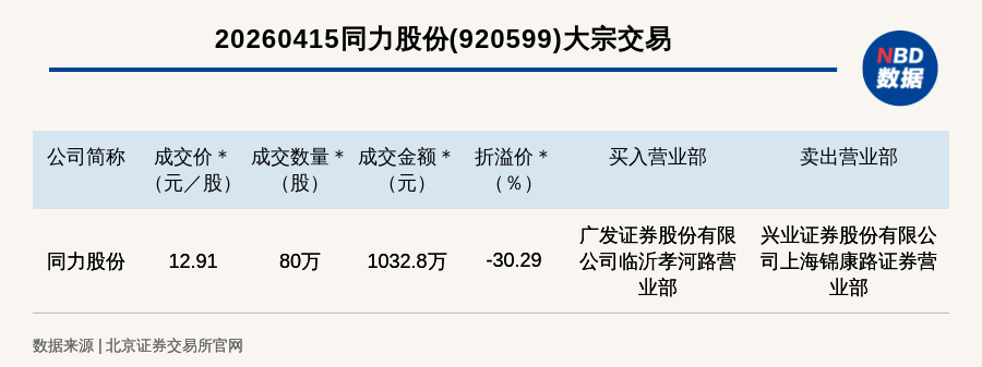 每經(jīng)訊,2026年4月15日,北交所上市公司同力股份(920599,收盤價(jià):18.52元)發(fā)生一筆大宗交易,成交價(jià)12.91元/股,成交數(shù)量80萬股,成交金額1032.8萬元,折價(jià)30.29%。買入營業(yè)部是廣發(fā)證券股份有限公司臨沂孝河路營業(yè)部,賣出營業(yè)部是興業(yè)證券股份有限公司上海錦康路證券營業(yè)部。