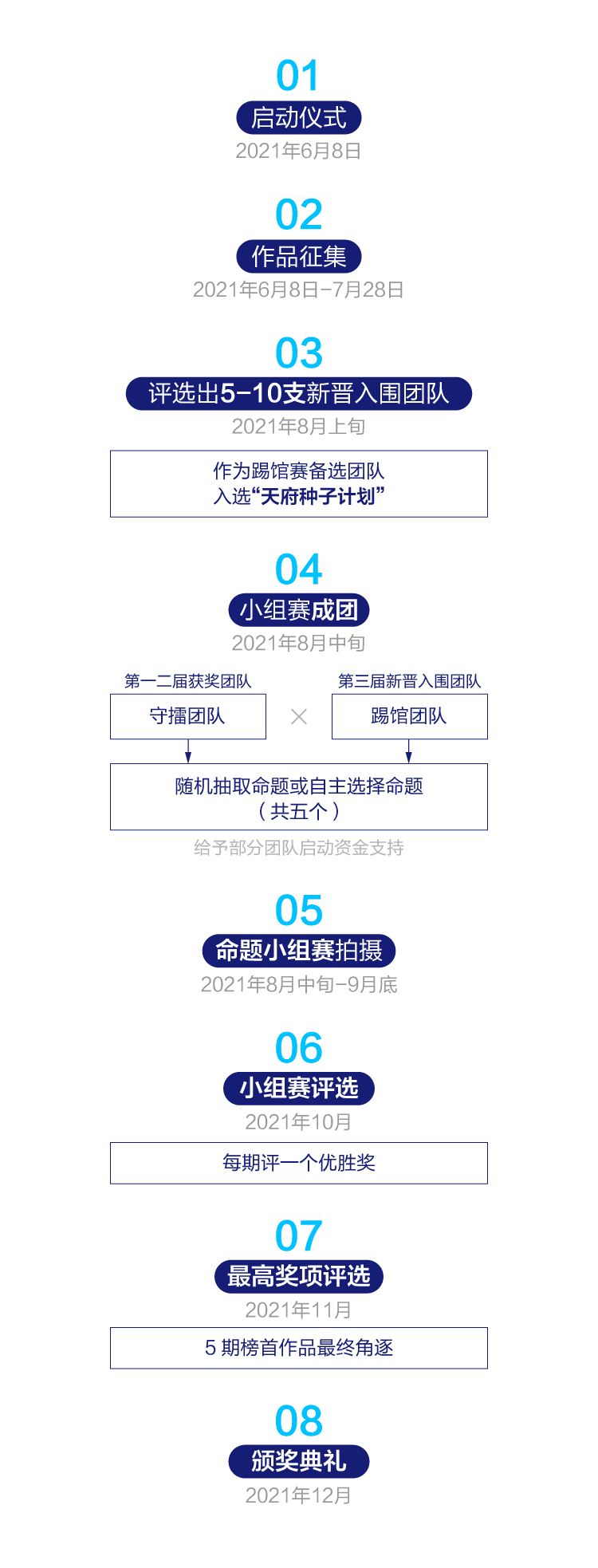 為鼓勵視頻創(chuàng)作,2021年將啟動“天府種子計劃”,高標準、高質(zhì)量生產(chǎn)以成都為主題/背景的影像IP。該計劃將通過“揭榜掛帥”的模式,發(fā)布5-10個提供啟動資金的“種子”項目,通過邀請俱樂部成員、社會報名、機構(gòu)推薦的形式,征集評選出視頻行業(yè)有潛力的承接團隊、個人。俱樂部將組織專業(yè)評審對入圍團隊/個人遞交的資料進行評議打分,選出各個“種子”項目的承接方并予以執(zhí)行。