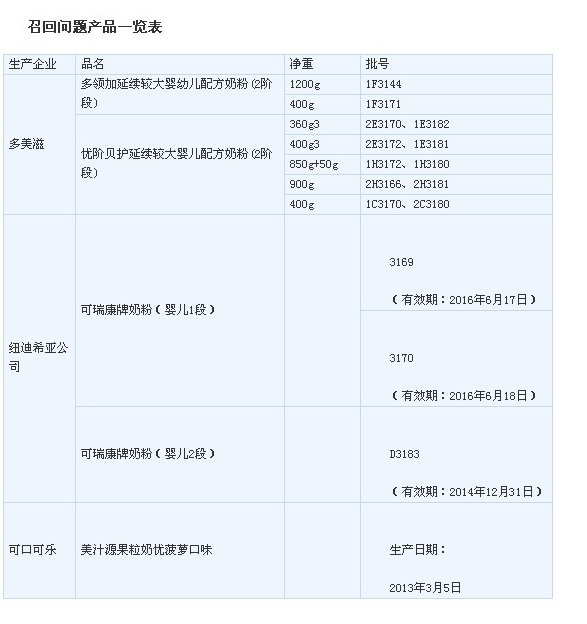 ·涉及產(chǎn)品:出廠批號(hào)分別為3169、3170的“可瑞康”1段(供0-6月嬰兒食用)和批號(hào)為D3183的“可瑞康”金裝版2段嬰兒配方奶粉(供6-12個(gè)月嬰兒食用)